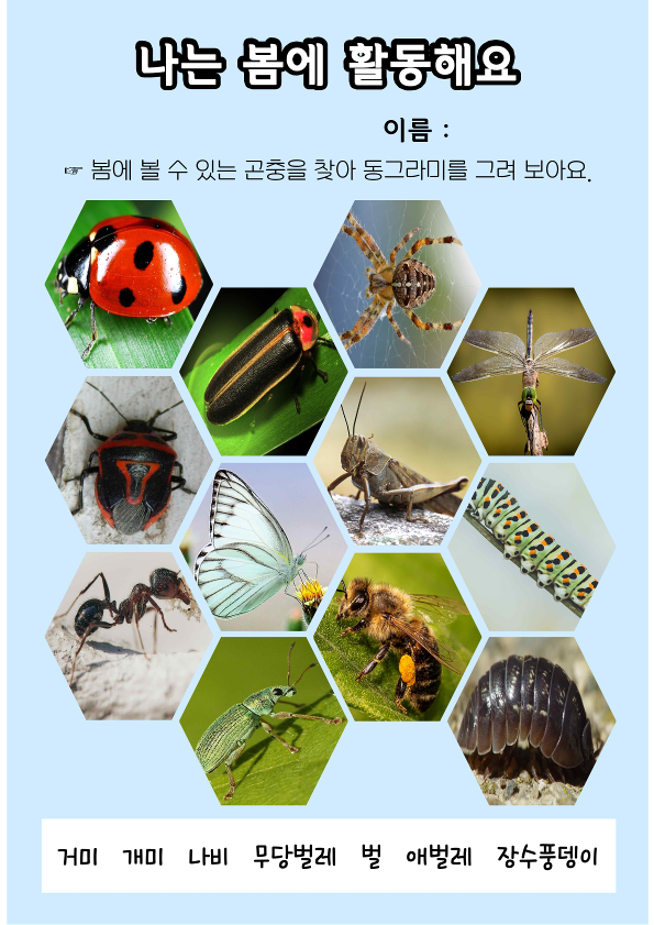 봄과 관련된 식물, 곤충, 동물 종류별로 준비해 보았어요.